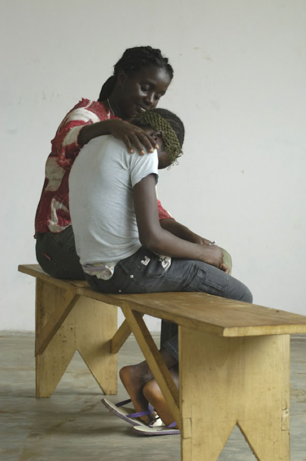 A social worker comforts a 12-year-old refugee girl from neighbouring Sierra Leone, Miata [NAME CHANGED], in an interim care centre run by the NGO Samaritan’s Purse International Relief, near Monrovia, the capital of Liberia in Janaury 2004. Miata came to Monrovia with her mother in July 2003, but her mother was killed one month later in a rocket explosion in the city. She did odd jobs and slept on the streets until she was brought to this centre (although she was not linked to any fighting group). Miata wants to return to her remaining family in Sierra Leone. UNICEF-assisted interim care centres provide children who have been associated with warring factions with counseling and basic educational and skills training to help them reintegrate into civil society.