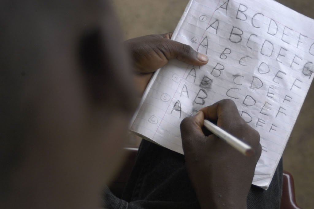 A boy practises writing the capital letters A to G in an exercise book, at a UNICEF-assisted interim care centre run by the international NGO Save the Children-United Kingdom, in Monrovia, the capital of Liberia in January 2004. Formerly a child soldier, the 11-year-old boy, who is from the north-eastern part of the country, was recruited into one of the fighting forces by his peers. He has not seen his family in four years but wants to return to them and to school. He says the first thing that he will do when he returns home is ìrun to my mother. UNICEF-assisted interim care centres provide children who have been associated with warring factions with counseling and basic educational and skills training to help them reintegrate into civil society.