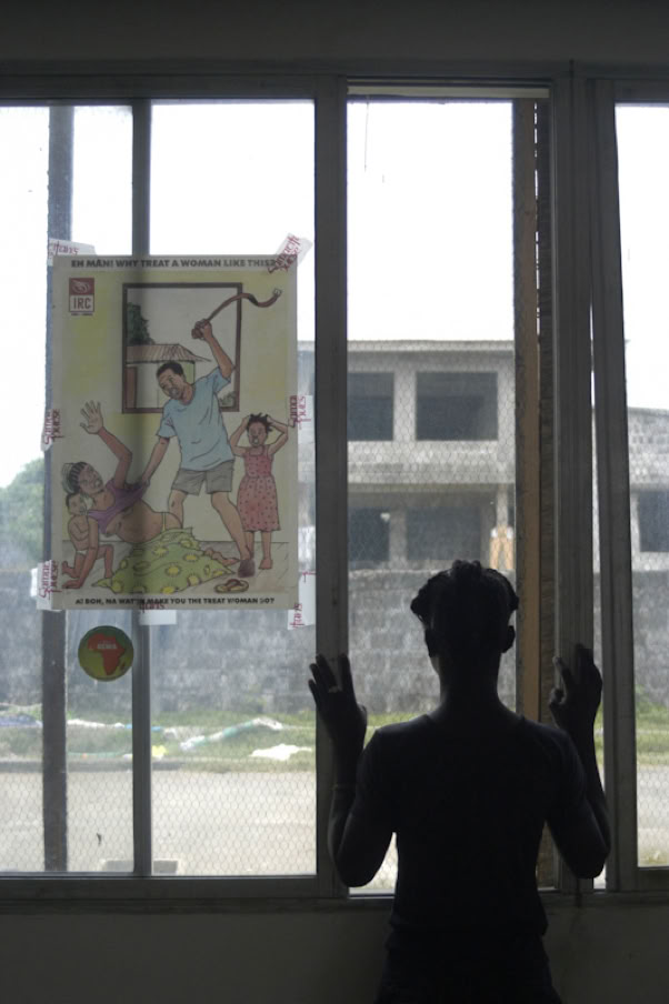 NAME CHANGED] Marie, a 14-year-old girl, looks out the window of an interim care centre run by the NGO Samaritan’s Purse International Relief, near Monrovia, the capital in January 2004. Marie was separated from her mother almost a year ago during an attack on her village in north-eastern Liberia. In the resulting confusion, she and four other girls joined one of the fighting groups, where they underwent military training and were issued weapons. After leaving this centre, she hopes to finish school and become a doctor. Taped to the window beside Marie is a poster opposing domestic abuse of women. UNICEF-assisted interim care centres provide children who have been associated with warring factions with counseling and basic educational and skills training to help them reintegrate into civil society.