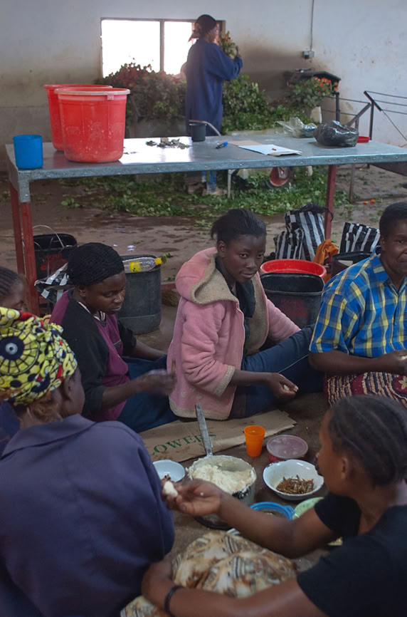 September 2010: Tasila takes a breakfast break with fellow workers at her job preparing roses for shipping at a flower farm, on the outskirts of Lusaka. Tasila rents a room close to her work with her fiancé, Nicholas.