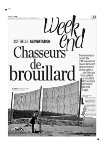 Fog nets used to capture water from rain and fog are a developmental initiative in practice in the Eastern Cape of South Africa. Fog forms when water vapour cools down and condenses to form tiny water droplets in the atmosphere. Apart from altitude, there is not much difference between clouds and fog. Fog formation is, however, directly affected by near-surface conditions, adiabatic cooling and flow patterns in the atmosphere. Fog collects on the nets and runs down into a tank. Many locations are suitable for fog water collection. Frequent fog episodes even appear in extremely dry regions, or high altitude mountains, where clean drinking water is not always accessible. Fog water may serve as an additional source of water, which in turn, may contribute significantly to the quality of life.